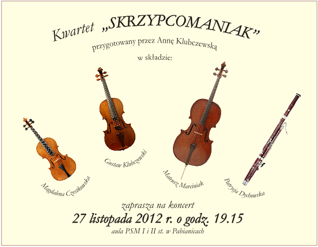 Skrzypcomaniak zaprasza 19.X.2016 na godz. 20:00 do auli PSM na Koncert Jesienny. Wystąpią również młodzi skrzypkowie z klasy prof. M.Karwat.