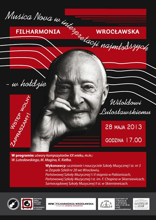 Młodzieżowa Orkiestra Kameralna z PSM I i II st. w Pabianicach i kwartet skrzypcowy "Wiolinki", obydwa zespoły prowadzone przez prof. Rafała Rydygera oraz ośmioosobowy zespół "Smyki" prowadzony przez prof. Małgorzatę Karwat wystąpią we wtorek - 28 maja 2013 roku, o godz. 17:00 w Filharmonii Wrocławskiej na koncercie z okazji 100-lecia urodzin Witolda Lutosławskiego. Reprezentanci szkoły muzycznej w Pabianicach wykonają m.in. koncert fortepianowy Miłosza Magina. Jako solistka zagra na fortepianie z towarzyszeniem orkiestry Oliwia Różańska.