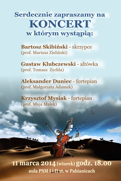 aniaklub 19/10/2016 01:15 Skrzypcomaniak zaprasza 19.X.2016 na godz. 20:00 do auli PSM na Koncert Jesienny. Wystąpią również młodzi skrzypkowie z klasy prof. M.Karwat.