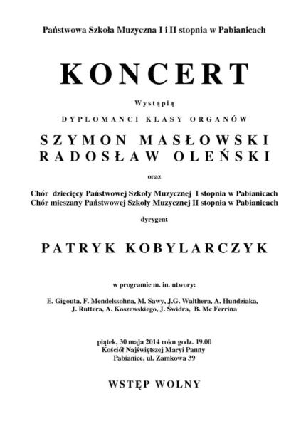 Koncert dyplomantów klasy organów był piękny! Gratuluję Szymonowi, Radkowi i ich prof. Beacie Kępińskiej (dlaczego nie ma jej na plakacie???, przygotowanym przez szkołę).