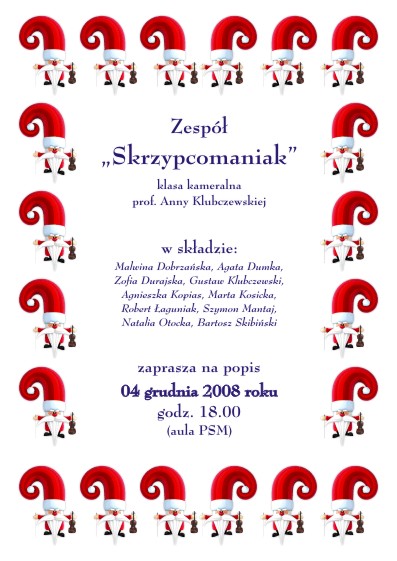 Skrzypcomaniak zaprasza 19.X.2016 na godz. 20:00 do auli PSM na Koncert Jesienny. Wystąpią również młodzi skrzypkowie z klasy prof. M.Karwat.